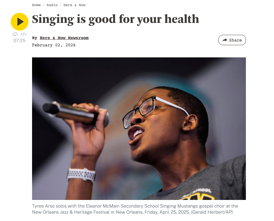 2026 “Singing in Good for Your Health.” Interviewed by Scott Tong, Here and Now, National Public Radio.